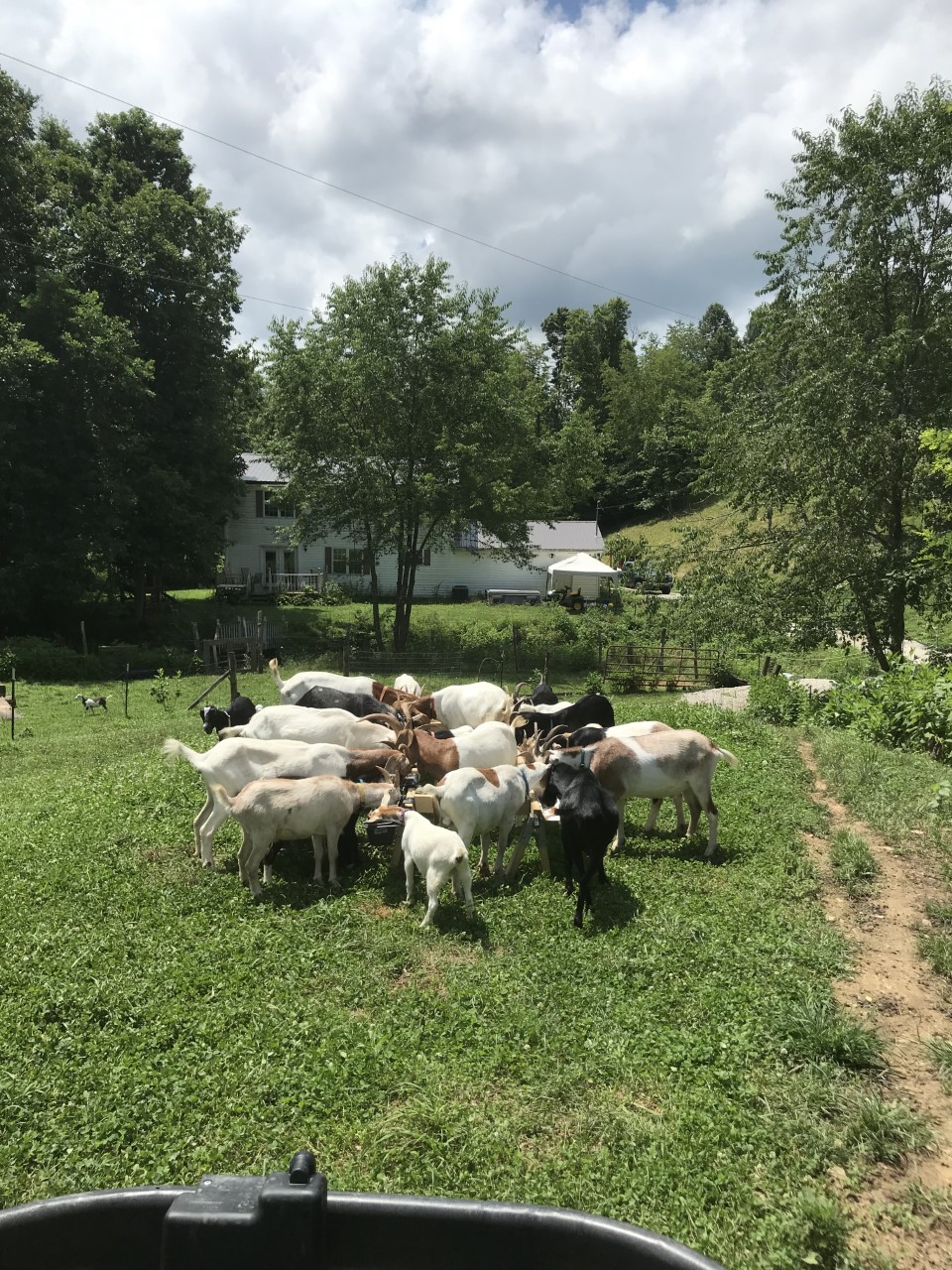 In that hope, we have been trying to work out a less difficult way to feed 38 goats (with horns). We created and built a new feeder for the goats out of a gutter and some treated 2x4s. It is pretty efficient and much easier to get the feed into. Then, we purchased a U-bottle from Rural King. I think it might actually be for gas but it makes an efficient feed pourer. The side of the spout is roughly the size of the gutter opening. Also a perk – the goats can’t try to eat out of it as I walk across the field to fill the feeder. The feeder seems large enough and spread out enough that all of the goats are getting to eat, but light enough to drag to different places when we want to move the madness! This is a general success, but I am contemplating those pool noodles for a few goats at feeding time!