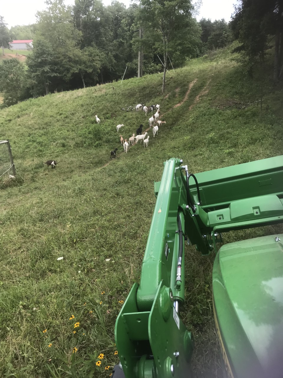 Ahhhhhhh, the BEST part of farming so far – riding on the Big Green Machine and cutting the weeds in the upper pastures. I ride – though John Deere and every other safety warning screams against extra riders. It is not easy to drive or ride, it’s still exhausting and makes all of my muscles sore – but at least progress is visible, and there is a slight breeze, and I don’t have to WALK up to the upper field.