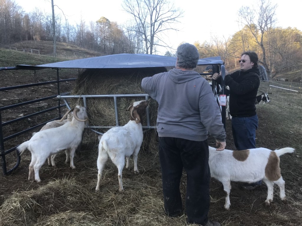 We figured out a way to feed the round bale hay under a cover and without having to muddy up the barnyard with the tractor as much. They seem to be happy to eat the hay from underneath, and so far, it seems to not churn up as much mud. Go us!