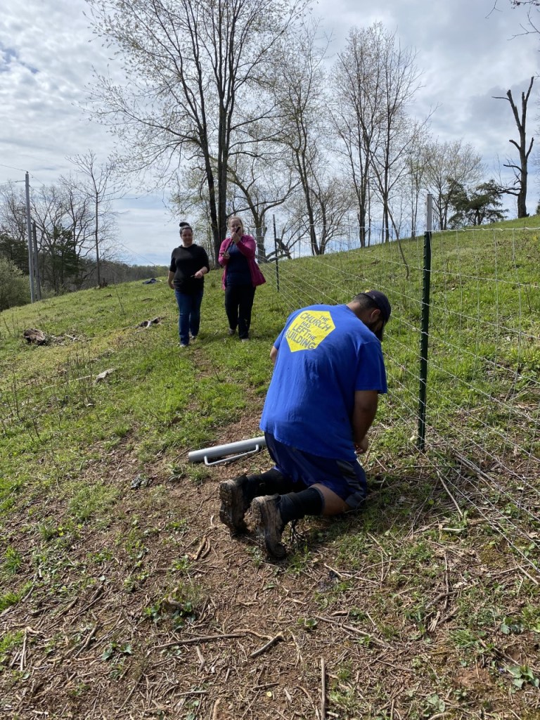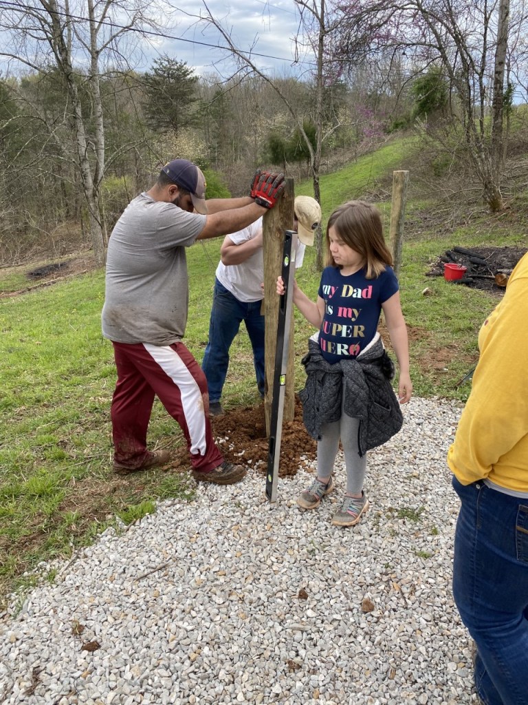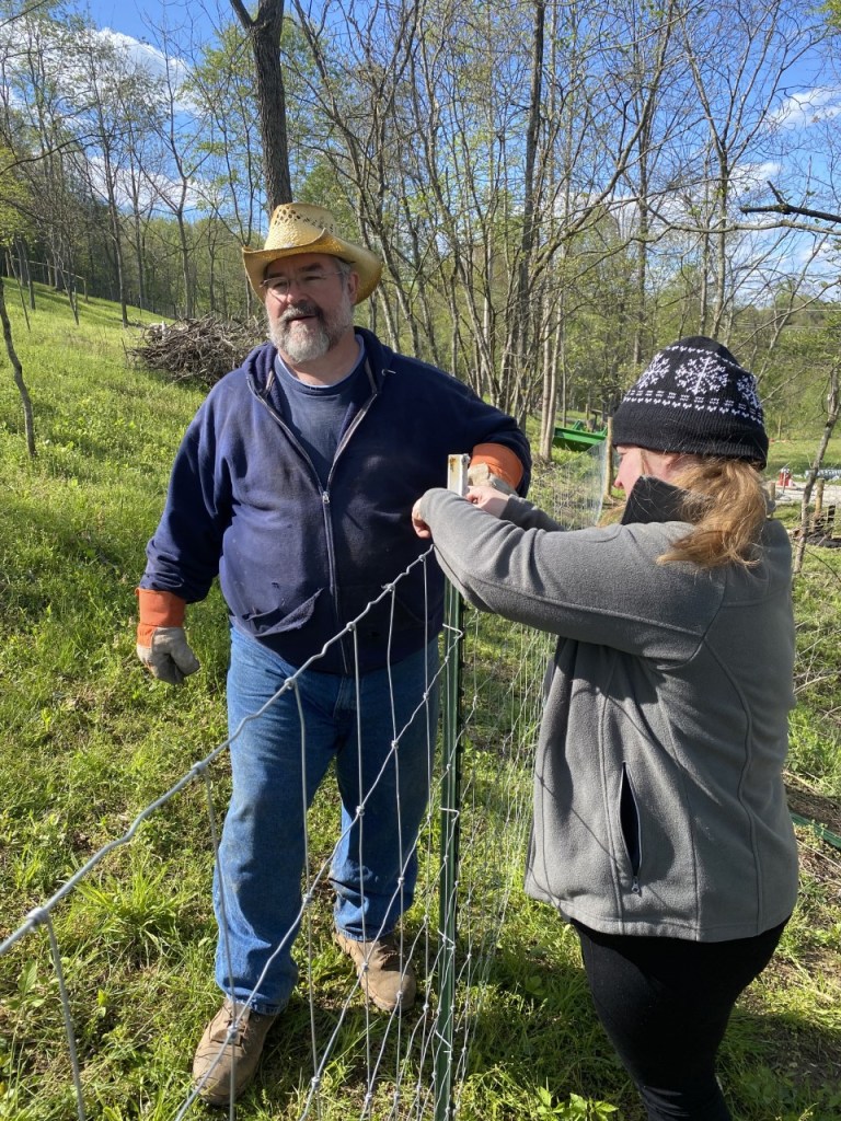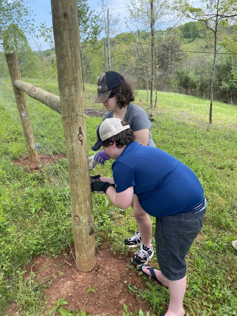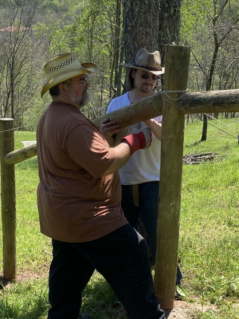 We continue toward our May 30th deadline with gusto! Farmer Man is almost to the end of his “no tamping” medical restriction – so the rest of us are VERY tired! 75 posts! He is able to drive the tractor, yay! As of today, all wood posts are set, all cross posting is done, most of the wire has been cut to do the cross-wiring part, and that can be done with a much smaller crew! Just a few more days of lighter work should produce 1000 ft. of fence to spec!